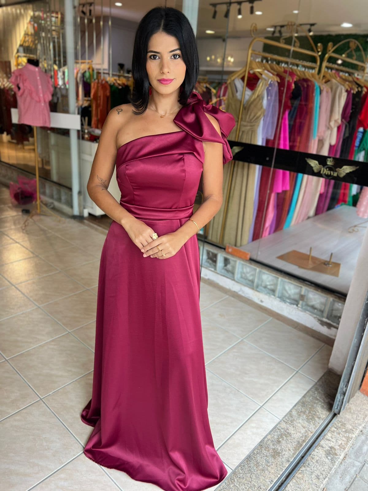 Encante em qualquer ocasião especial com este deslumbrante vestido longo na cor vinho. Com design moderno e sofisticado, ele apresenta uma modelagem acinturada que valoriza a silhueta, decote assimétrico com um laço elegante no ombro, e acabamento em tecido acetinado que garante um brilho sutil e requintado.